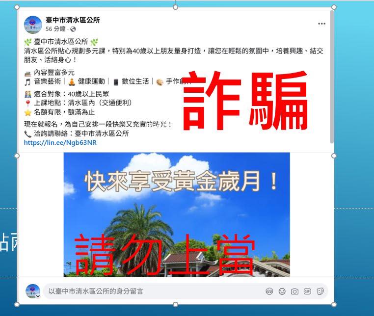 防詐宣導_n 【重要公告|防詐騙提醒】 近日發現有不肖人士冒用「清水區公所」名義,在臉書刊登「多元課程招生中」等詐騙訊息。 這是【詐騙訊息】!請市民朋友務必提高警覺。 本所未曾辦理此類活動 也未授權任何單位或個人以「清水區公所」名義招生 若接獲可疑訊息,請勿輕信、不點連結、不提供個資 清水區公所所有正式活動、課程與公告 均會公布於【官方網站】或【公佈欄】。 如有疑問,請立即撥打以下電話查證: 清水區公所:04-26270151